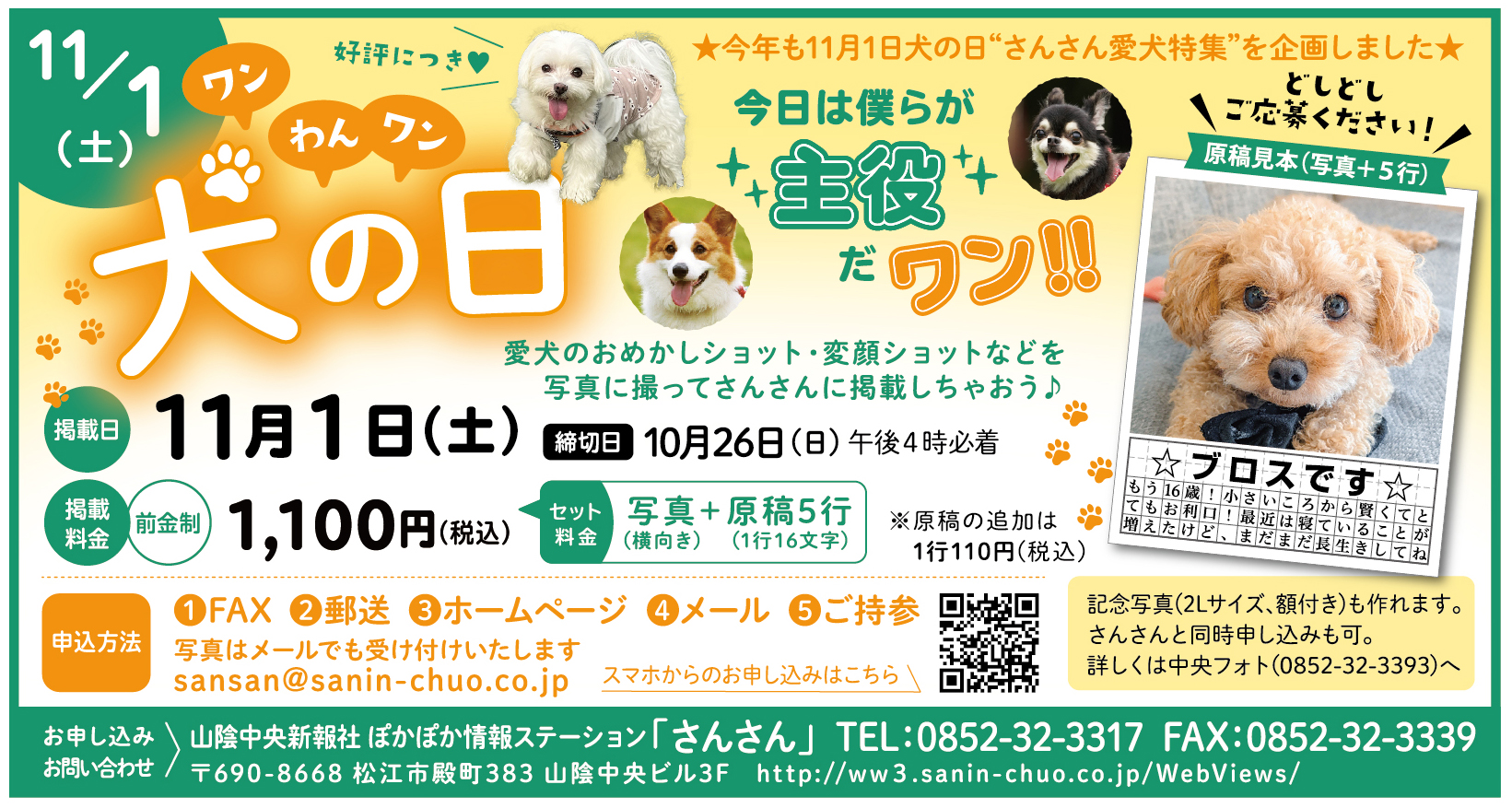 さんさんでは11月1日(土)掲載の「犬の日メッセージ」を募集中です。